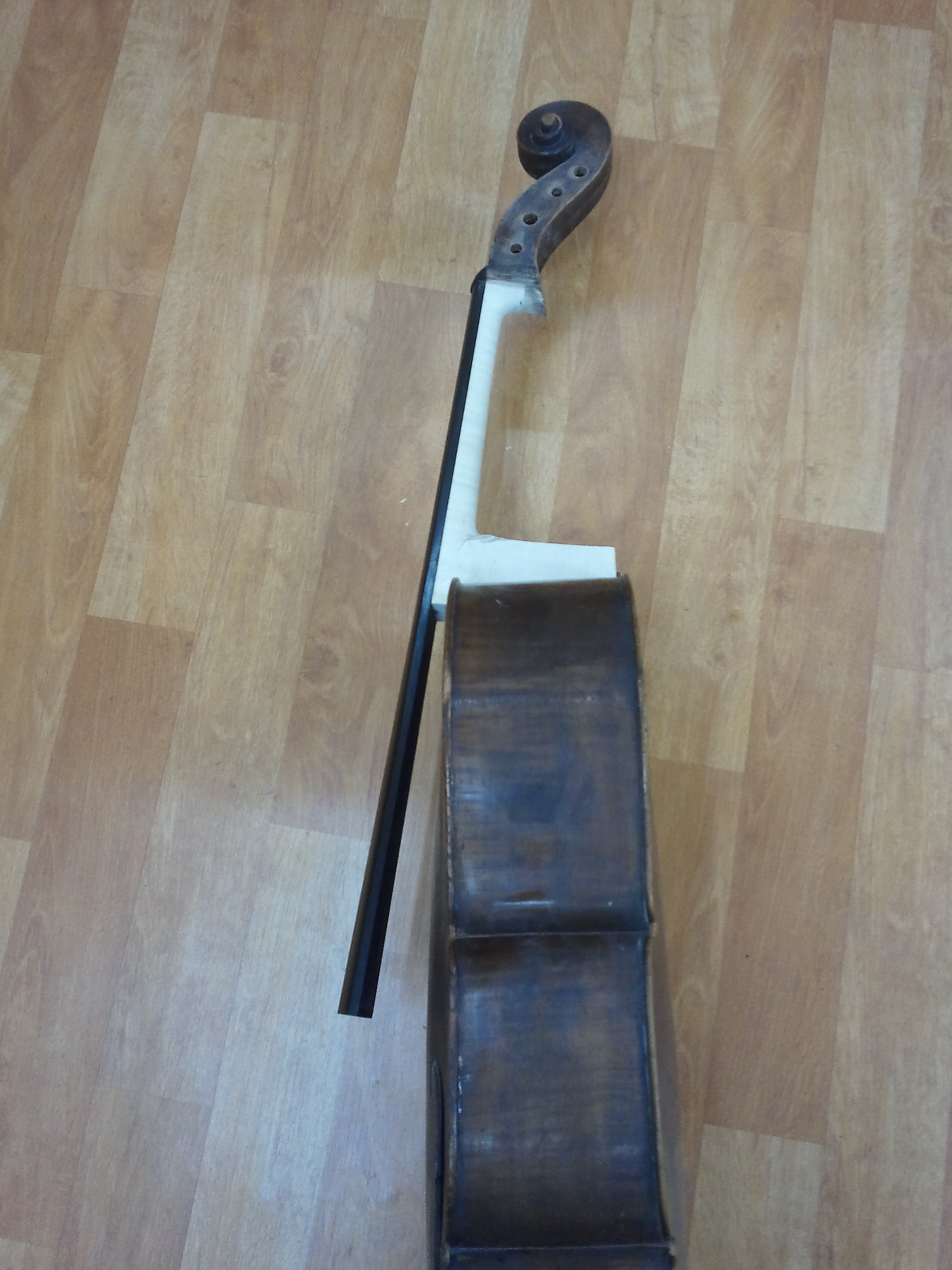 수리된 첼로의 몸통과 수리후 결합된 넥