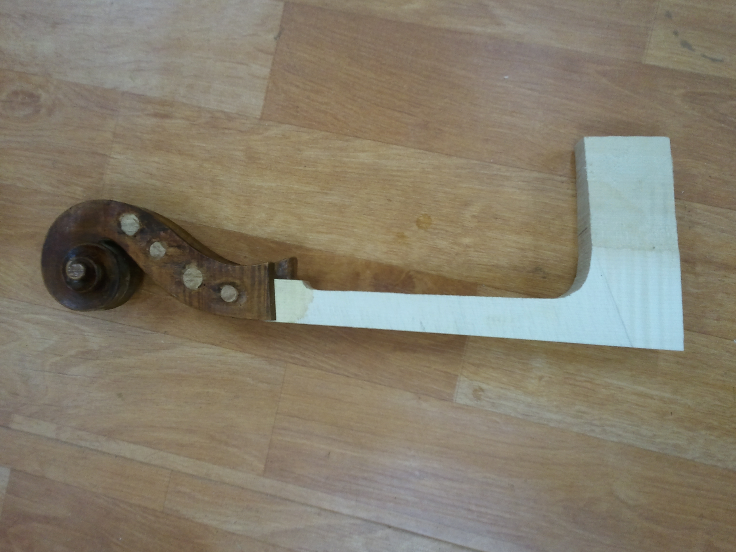 수리된 첼로의 몸통과 수리후 결합된 넥