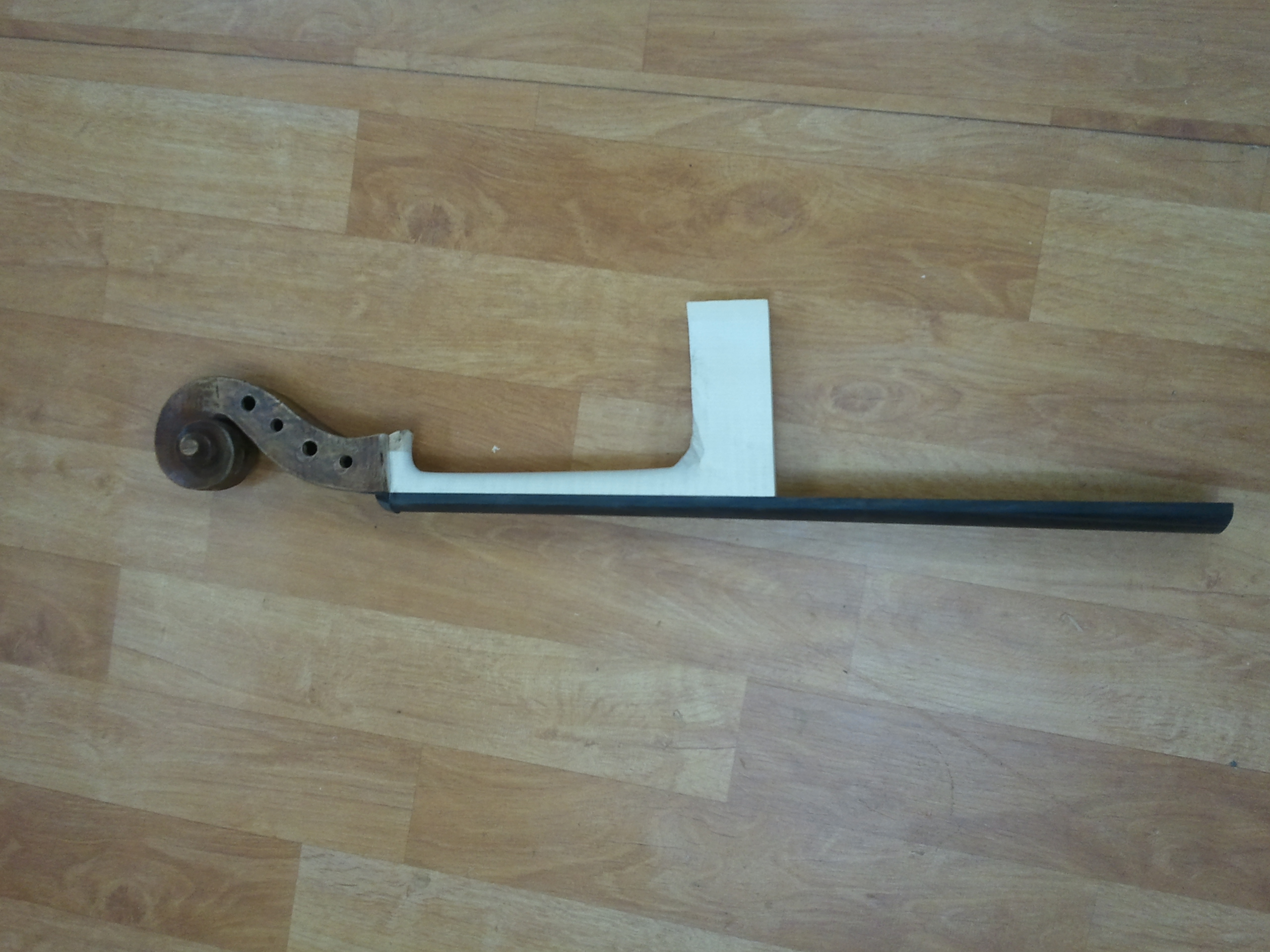 수리된 첼로의 몸통과 수리후 결합된 넥