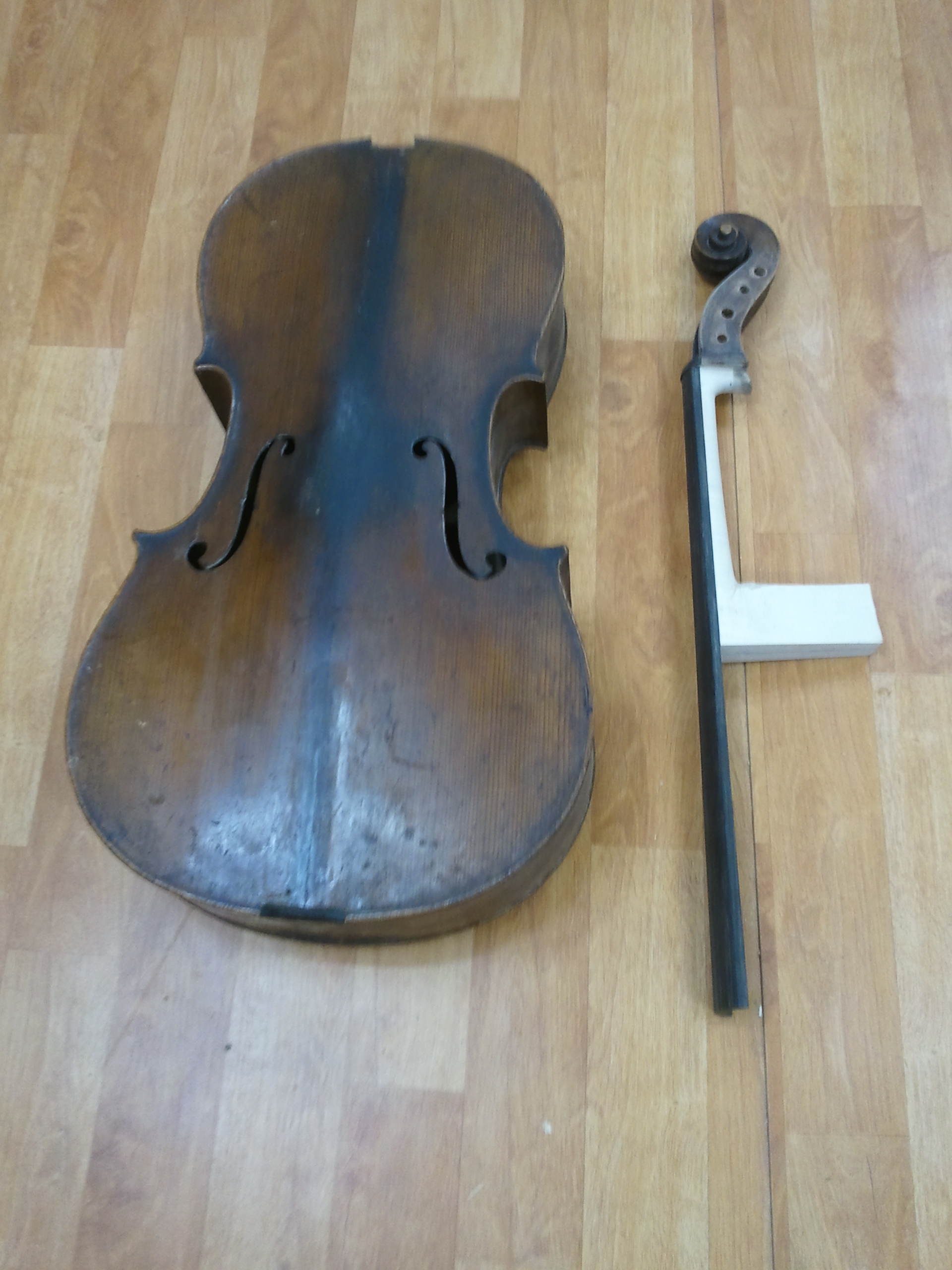 수리된 첼로의 몸통과 수리후 결합된 넥